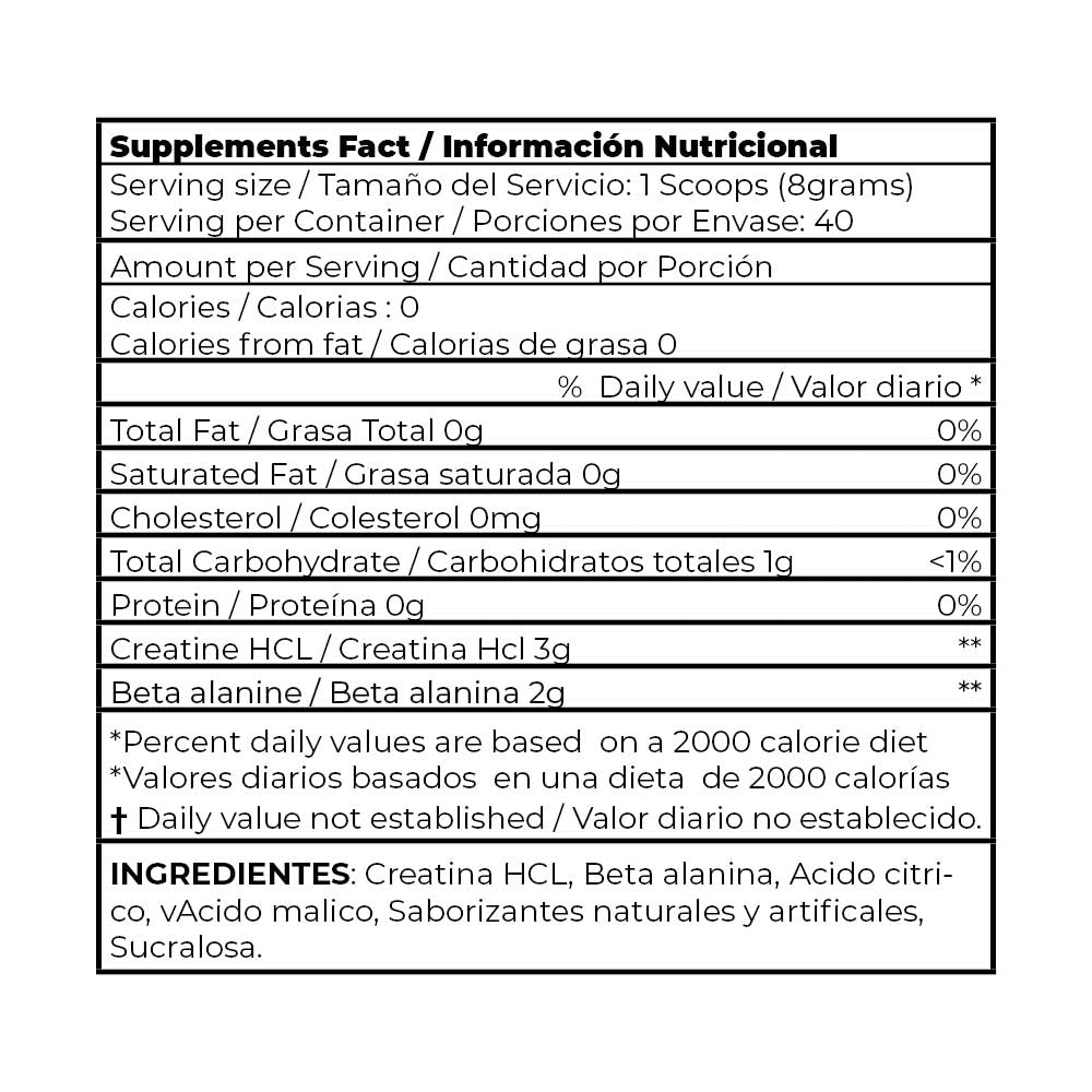 • Efectos secundarios posibles: La beta-alanina puede causar hormigueo inofensivo (parestesia) en dosis altas; nuestra fórmula minimiza este efecto pero es importante tener presente que se puede presentar y que con el uso continuo va disminuyendo.